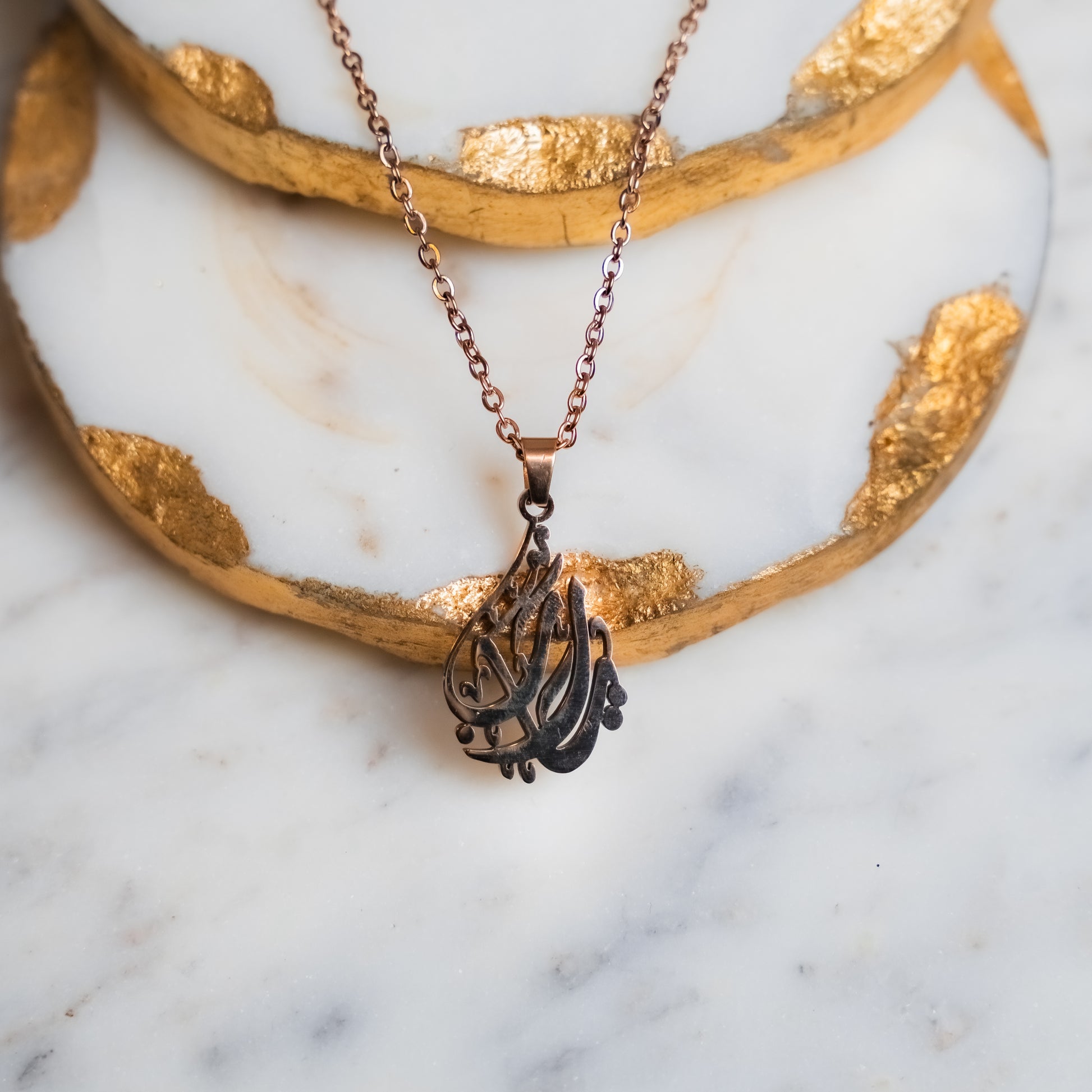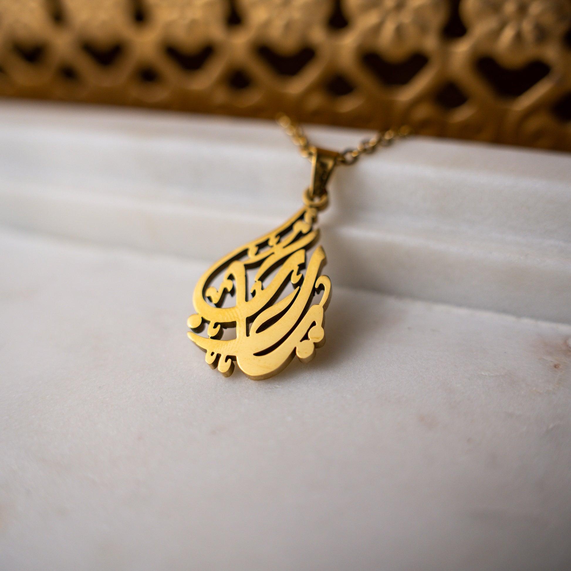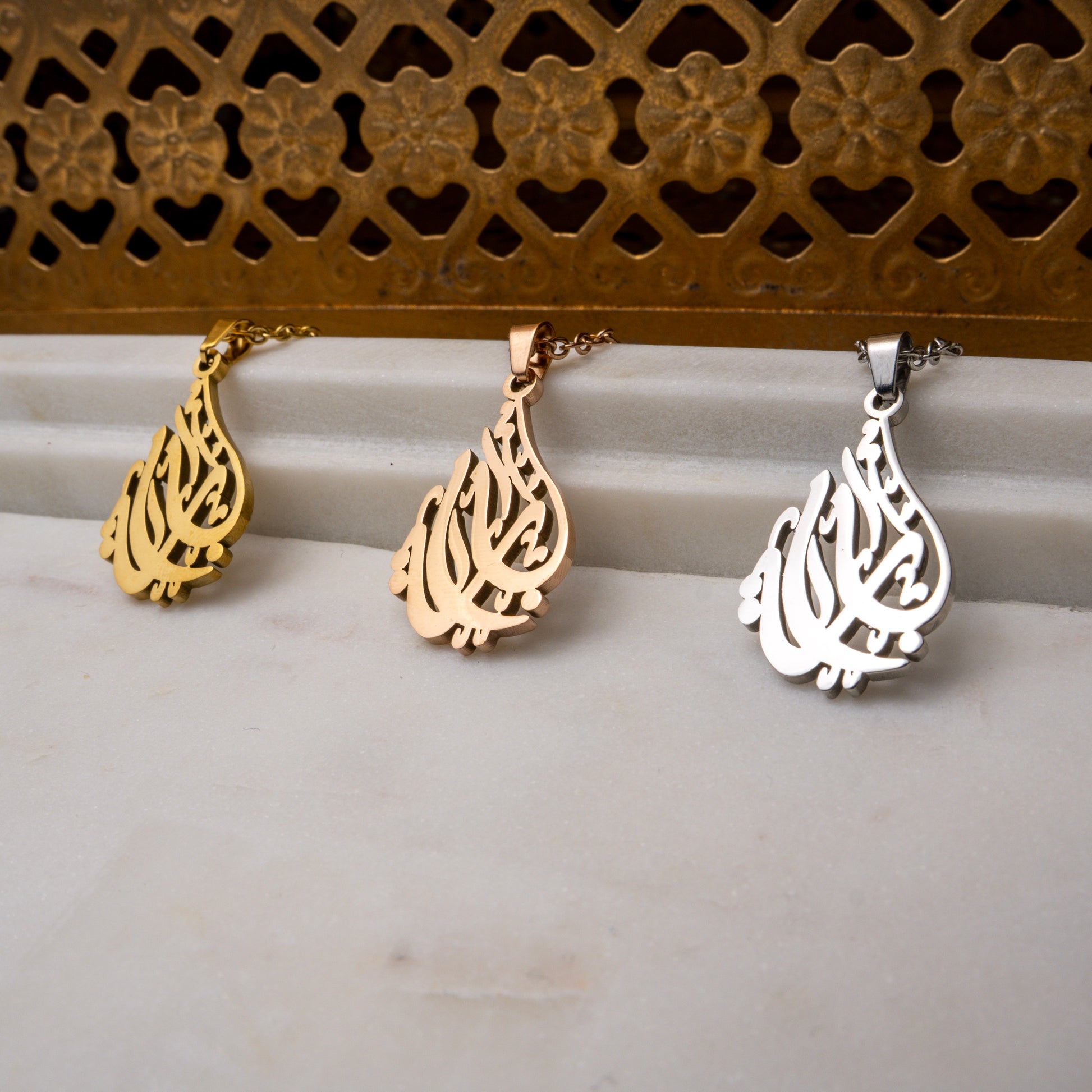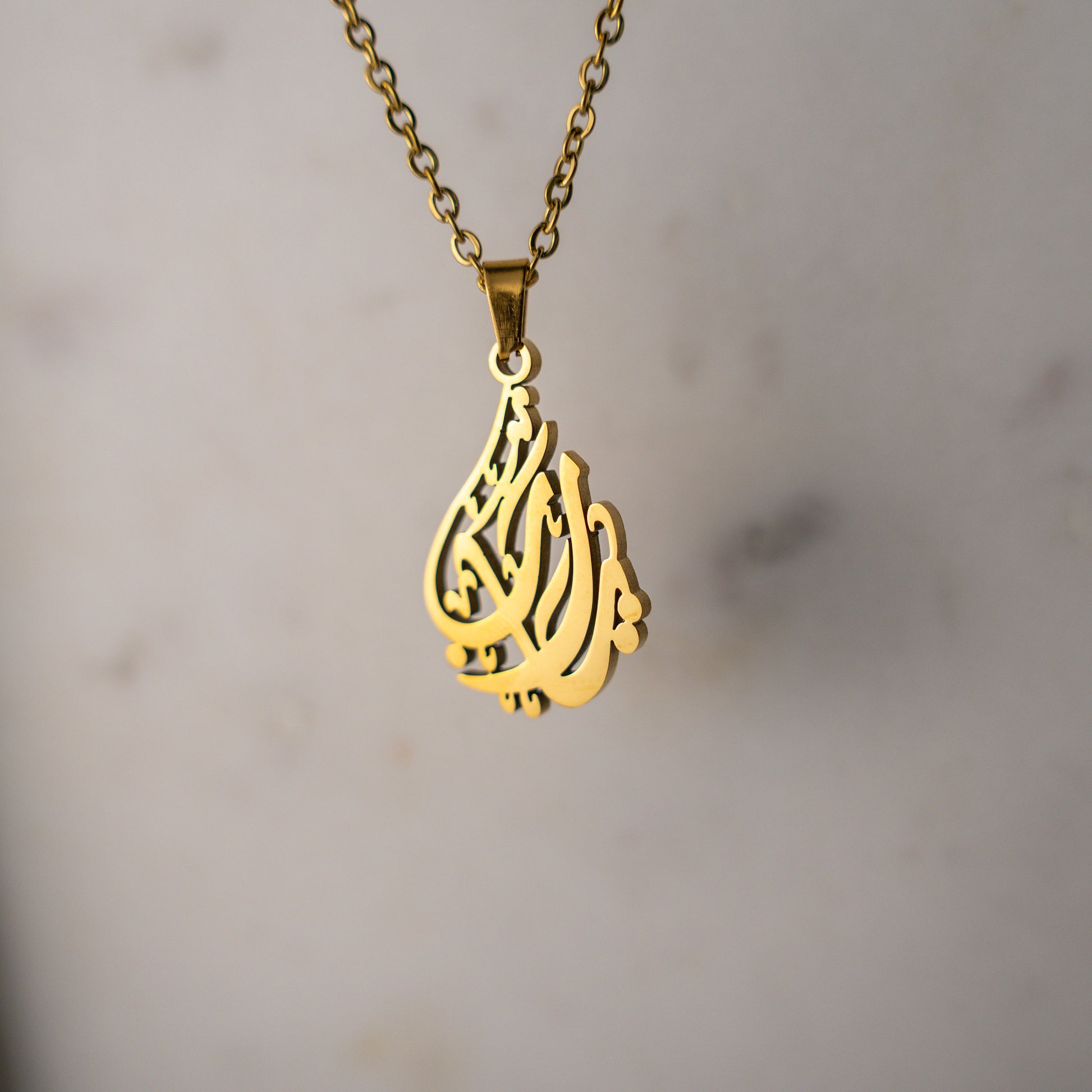 This stainless steel necklace features the name Allah artfully rendered in Arabic calligraphy, framed by an elegant teardrop shape. Its refined design offers a timeless and graceful expression of faith, perfect for those who appreciate subtle sophistication.