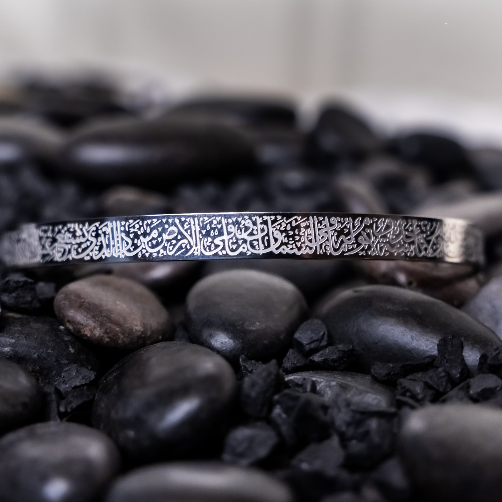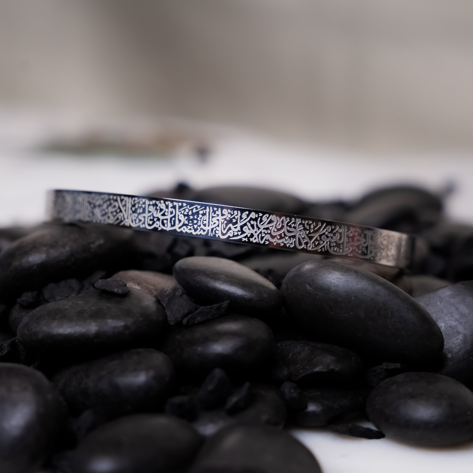 This elegant open cuff features an engraving of Ayat al-Kursi, a revered verse from the Quran (Surah Al-Baqarah 2:255). Its slender, gently curved design contours smoothly to the wrist, combining spiritual significance with refined style.