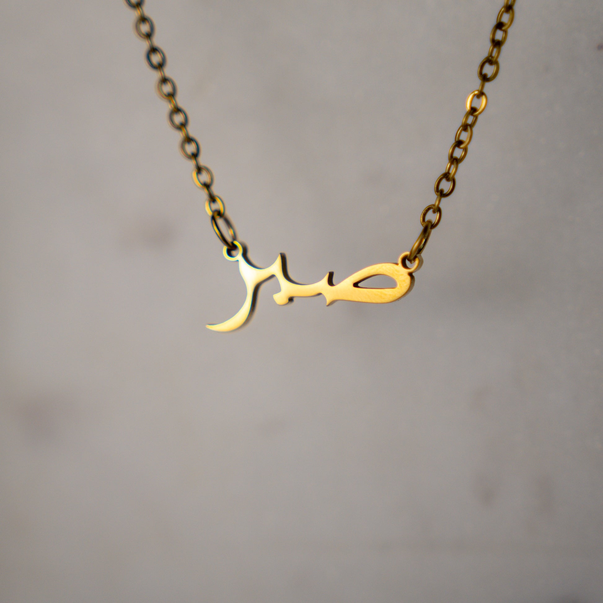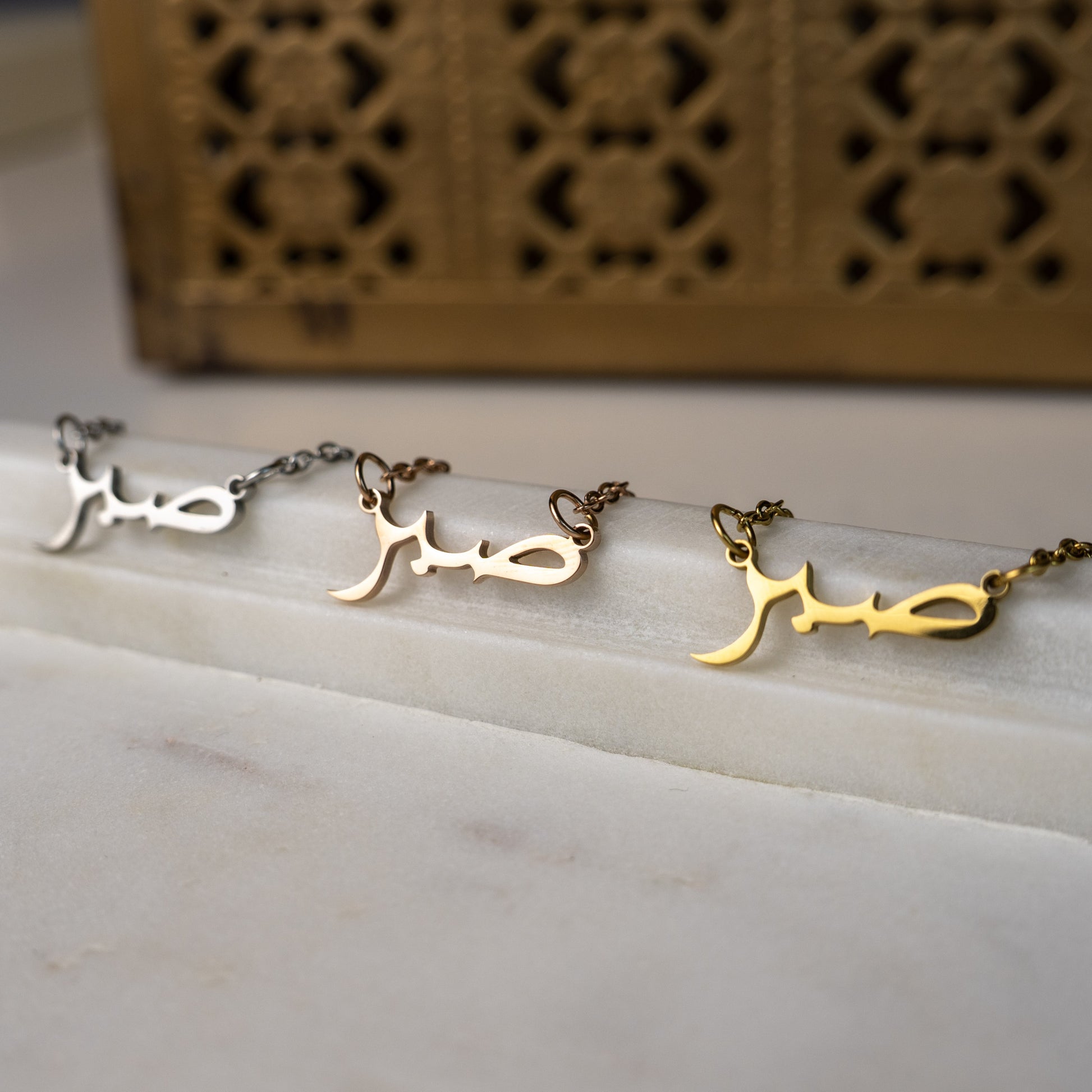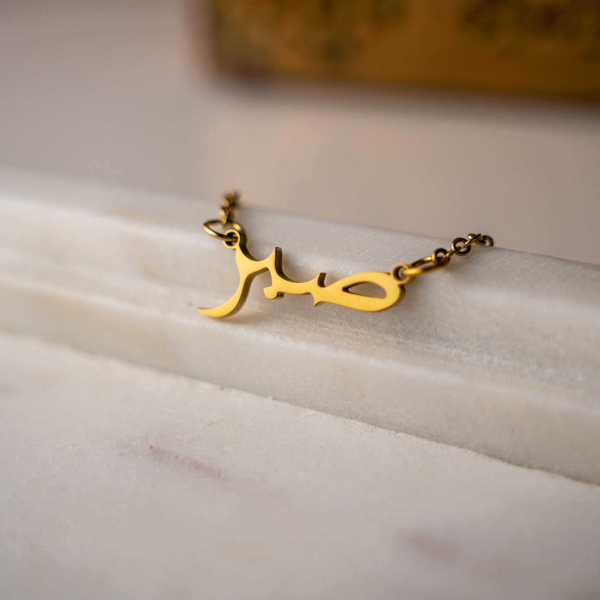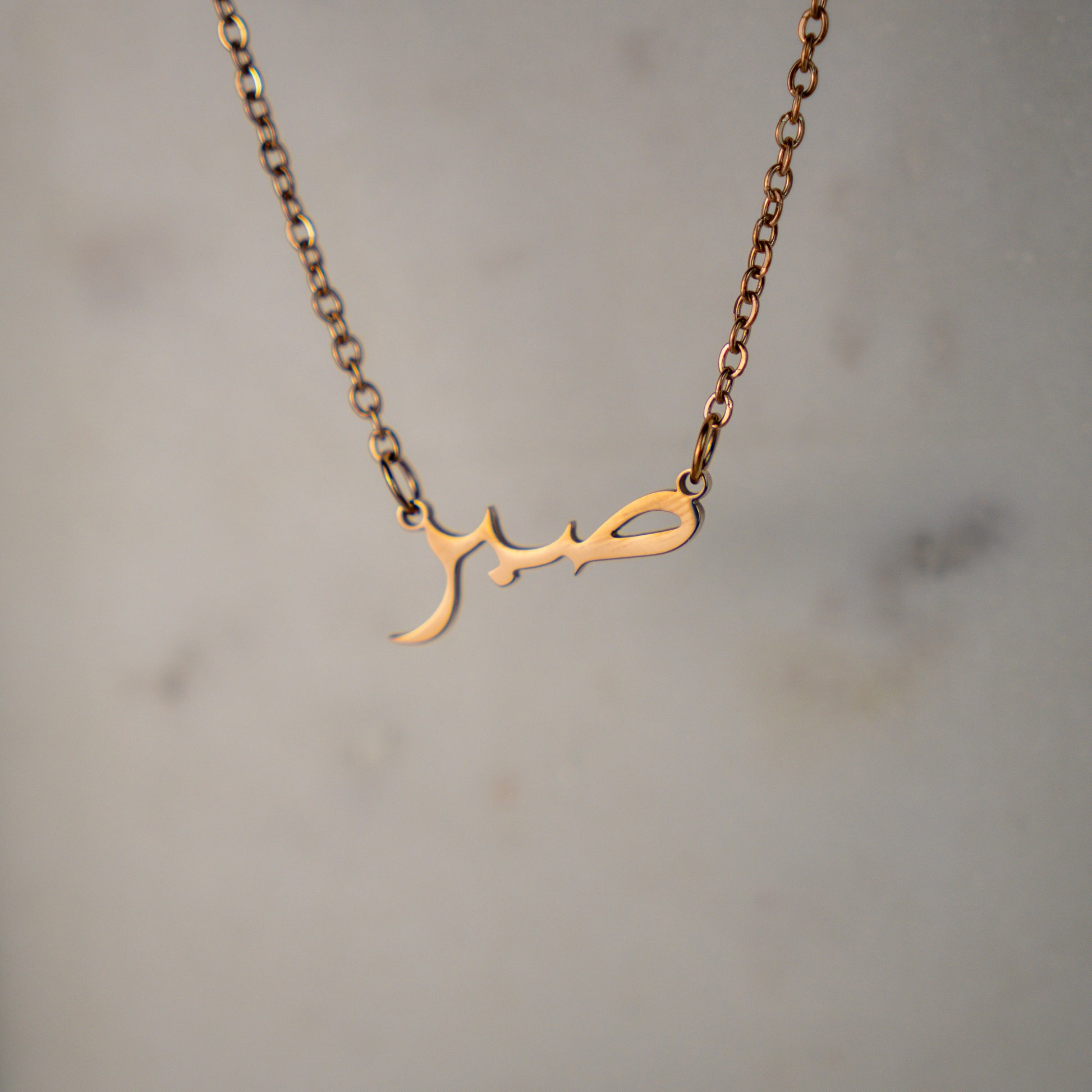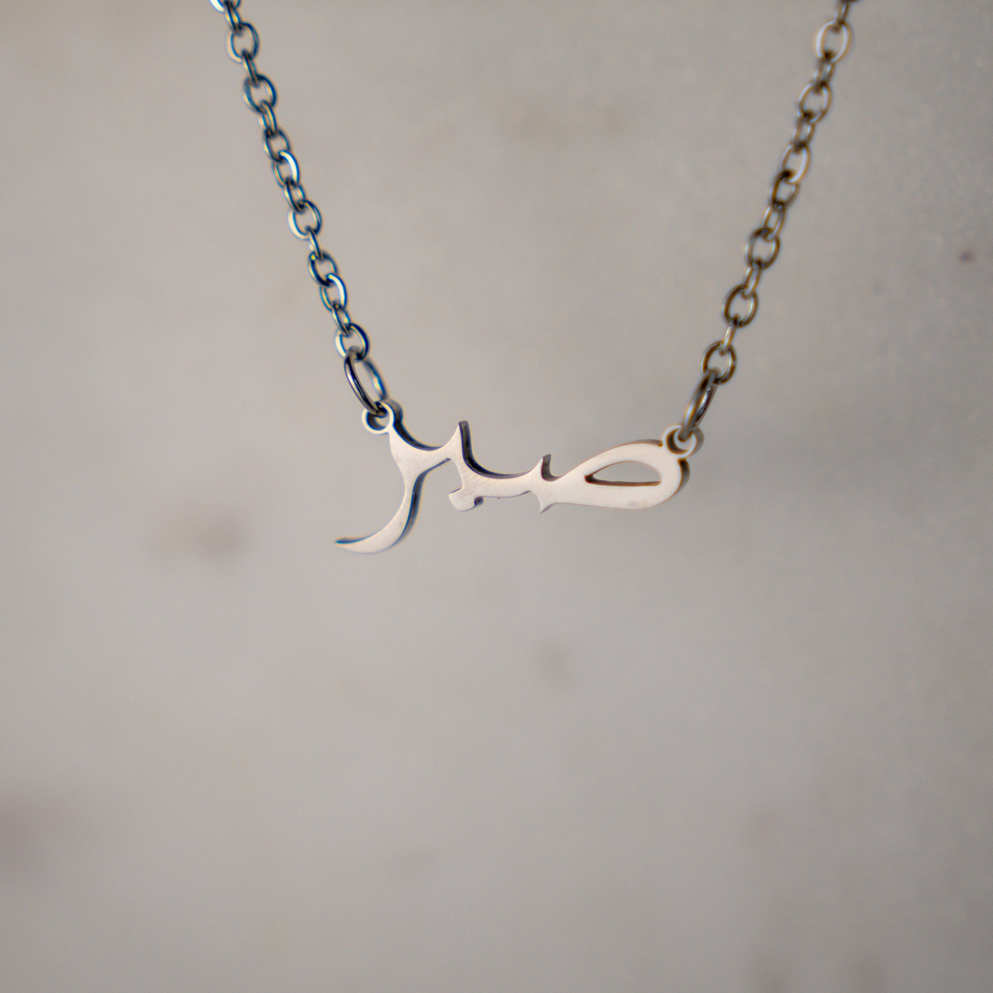The Sabr Necklace elegantly displays the word "Sabr" (صبر) in graceful Arabic calligraphy, symbolizing patience, strength, and resilience. This refined piece serves as a gentle reminder to embrace faith and calm through life’s challenges, making it a meaningful and timeless accessory.