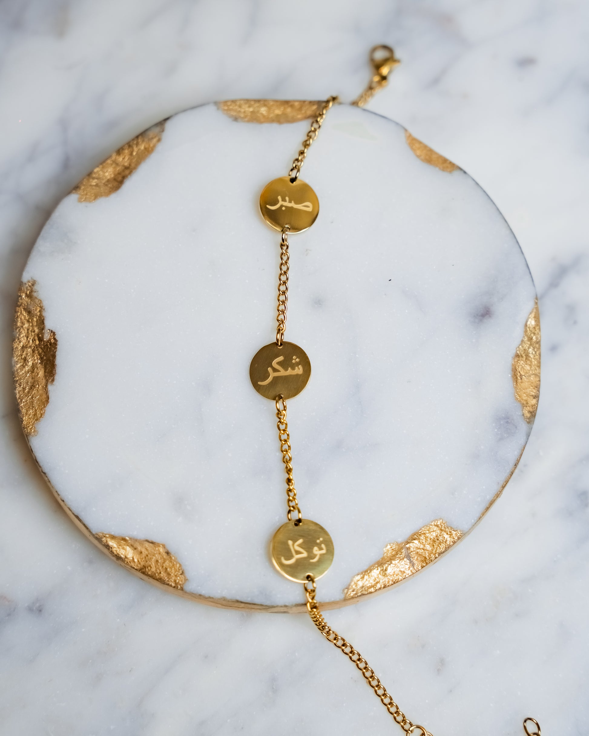 This elegant bracelet features three delicate round charms, each engraved with the Arabic words Sabr (patience), Shukr (gratitude), and Tawakkul (trust in Allah). Its minimalist design carries profound meaning, serving as a refined daily reminder to embody these essential values with grace and intention. A sophisticated accessory that blends spiritual significance with timeless style.