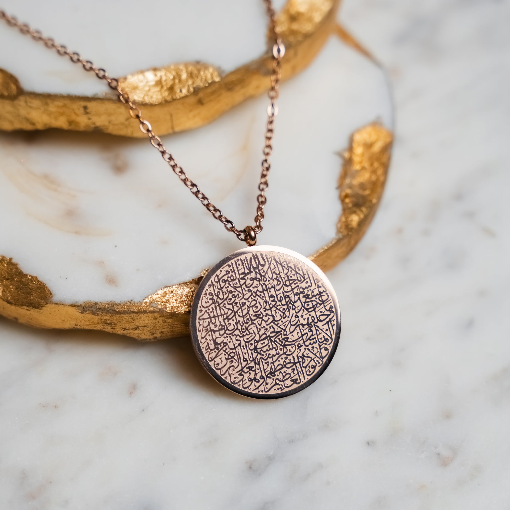 This pendant features an exquisite engraving of Ayat Al-Kursi, the Verse of the Throne, one of the most revered passages in the Qur'an. It serves as an elegant symbol of Allah’s protection, mercy, and dominion, designed to be worn near the heart as a lasting reminder.