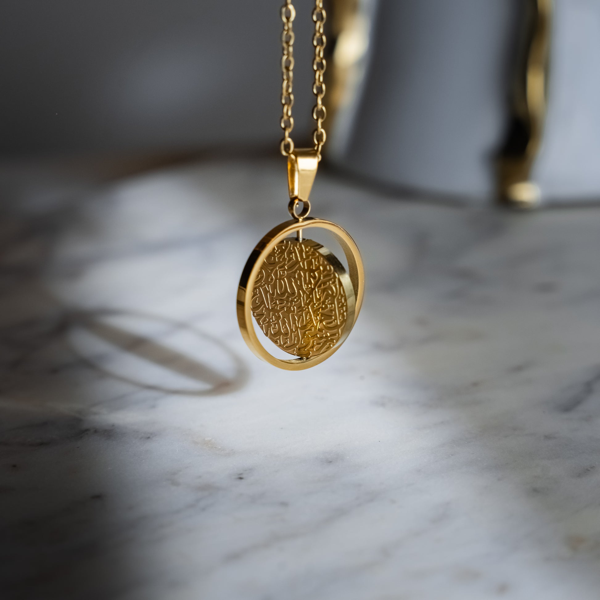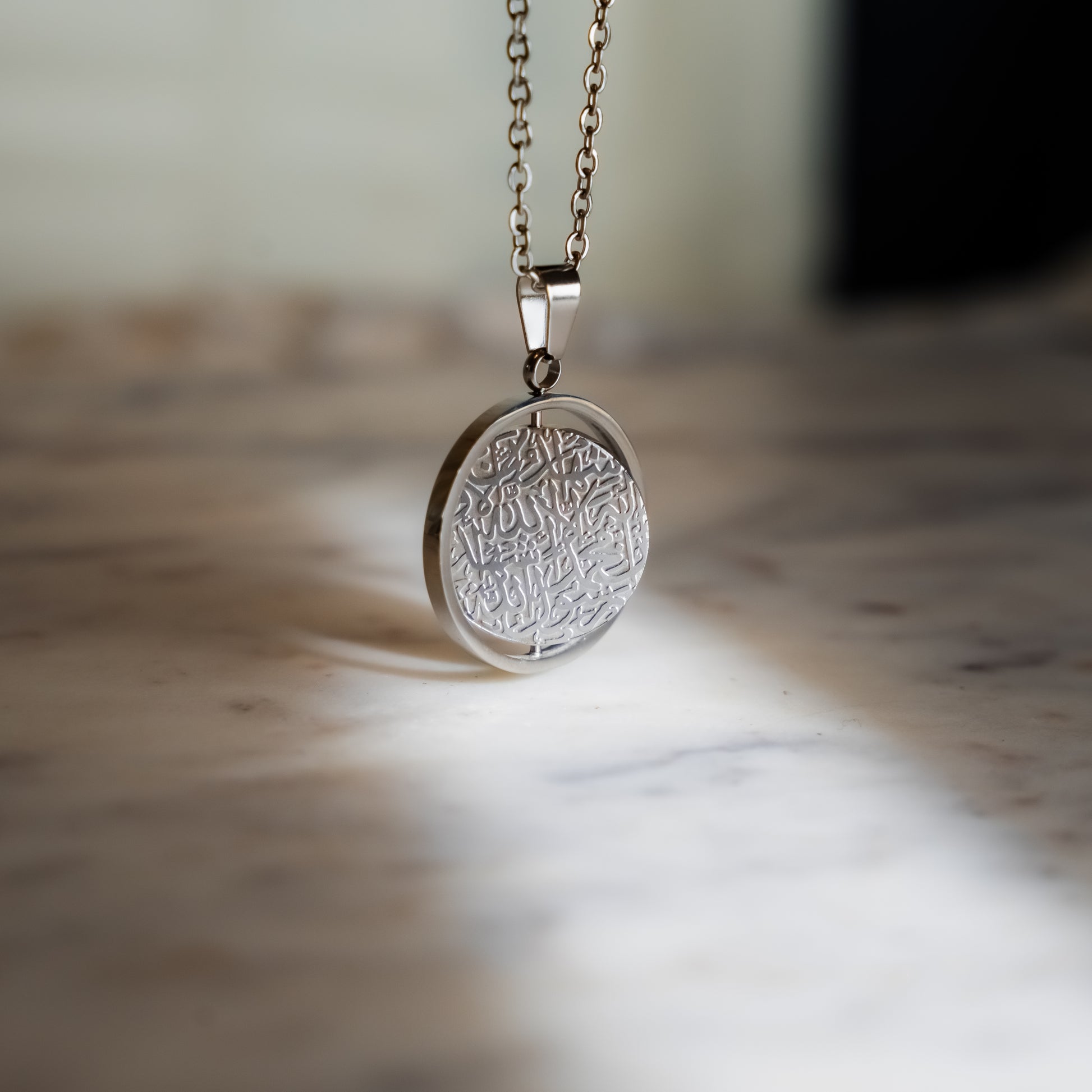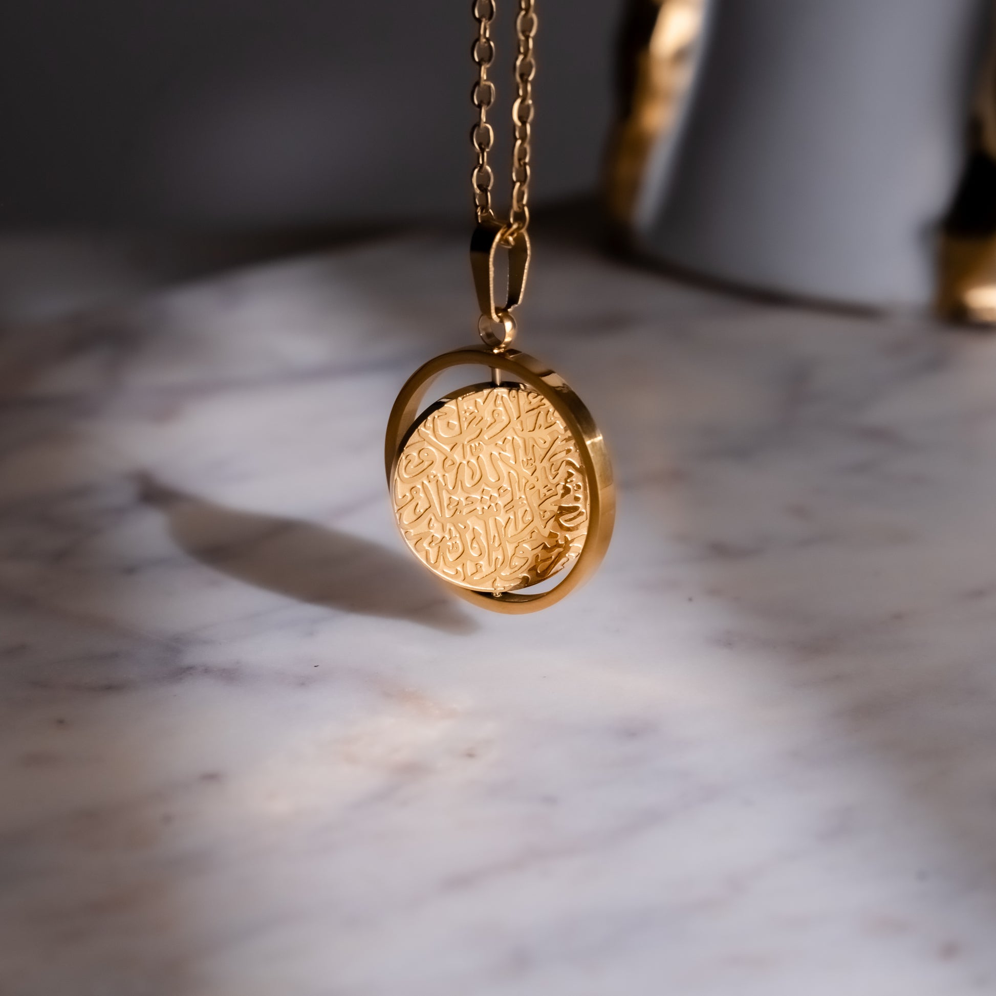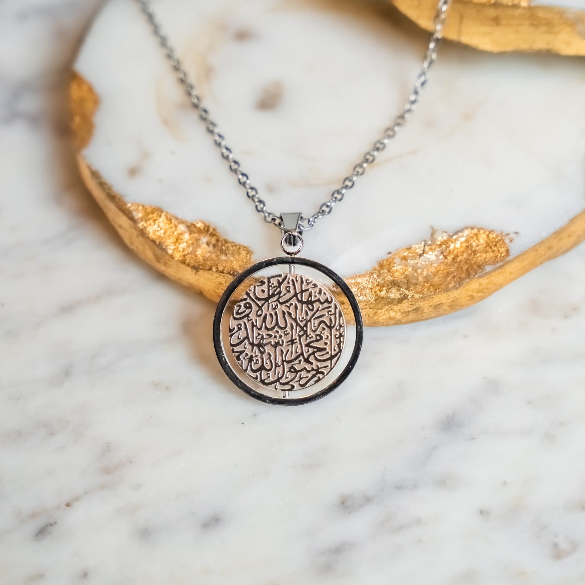 This elegant necklace showcases the Shahada exquisitely engraved in Arabic on a rotating disc, encased within a refined circular frame. Its smooth spinning design brings a subtle movement that enhances the profound significance of this timeless declaration of faith, making it a sophisticated accessory for everyday wear or special occasions.