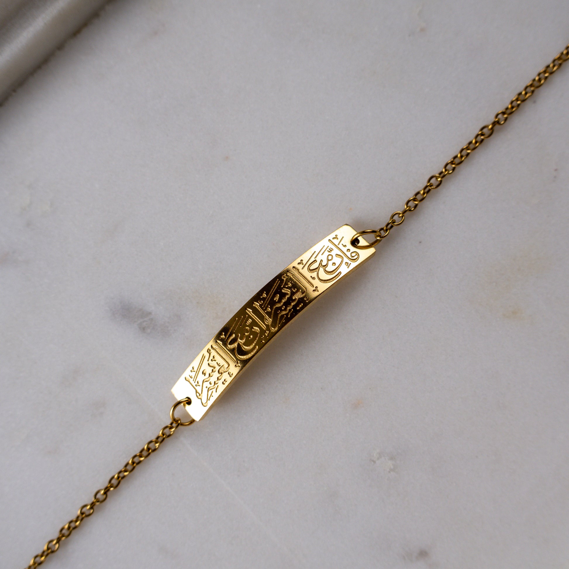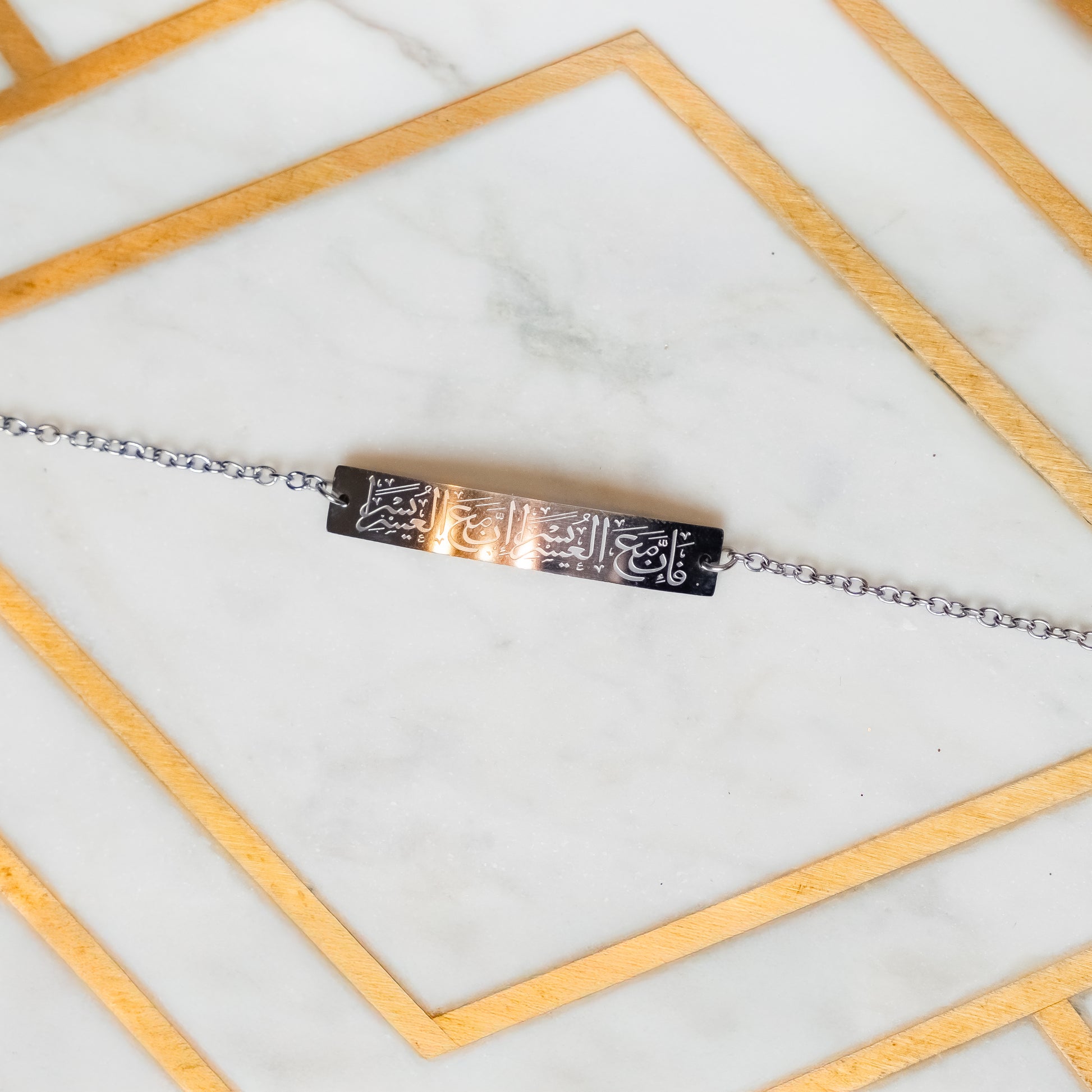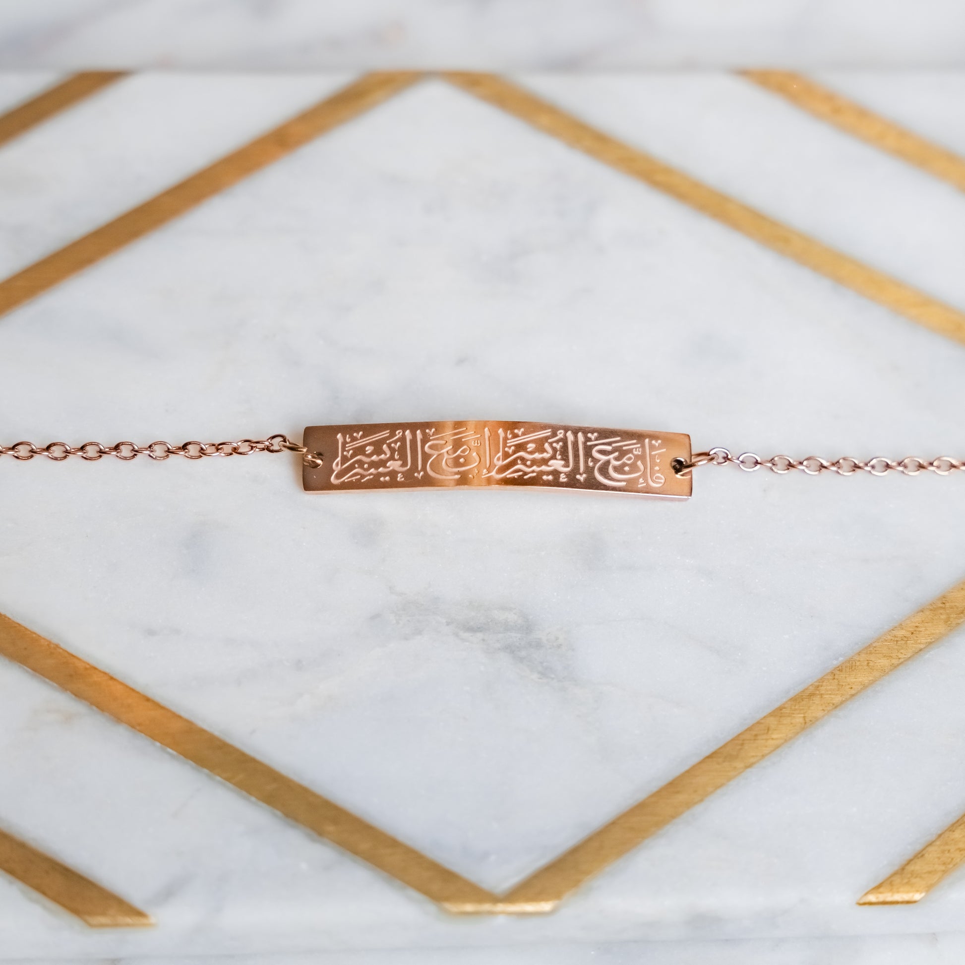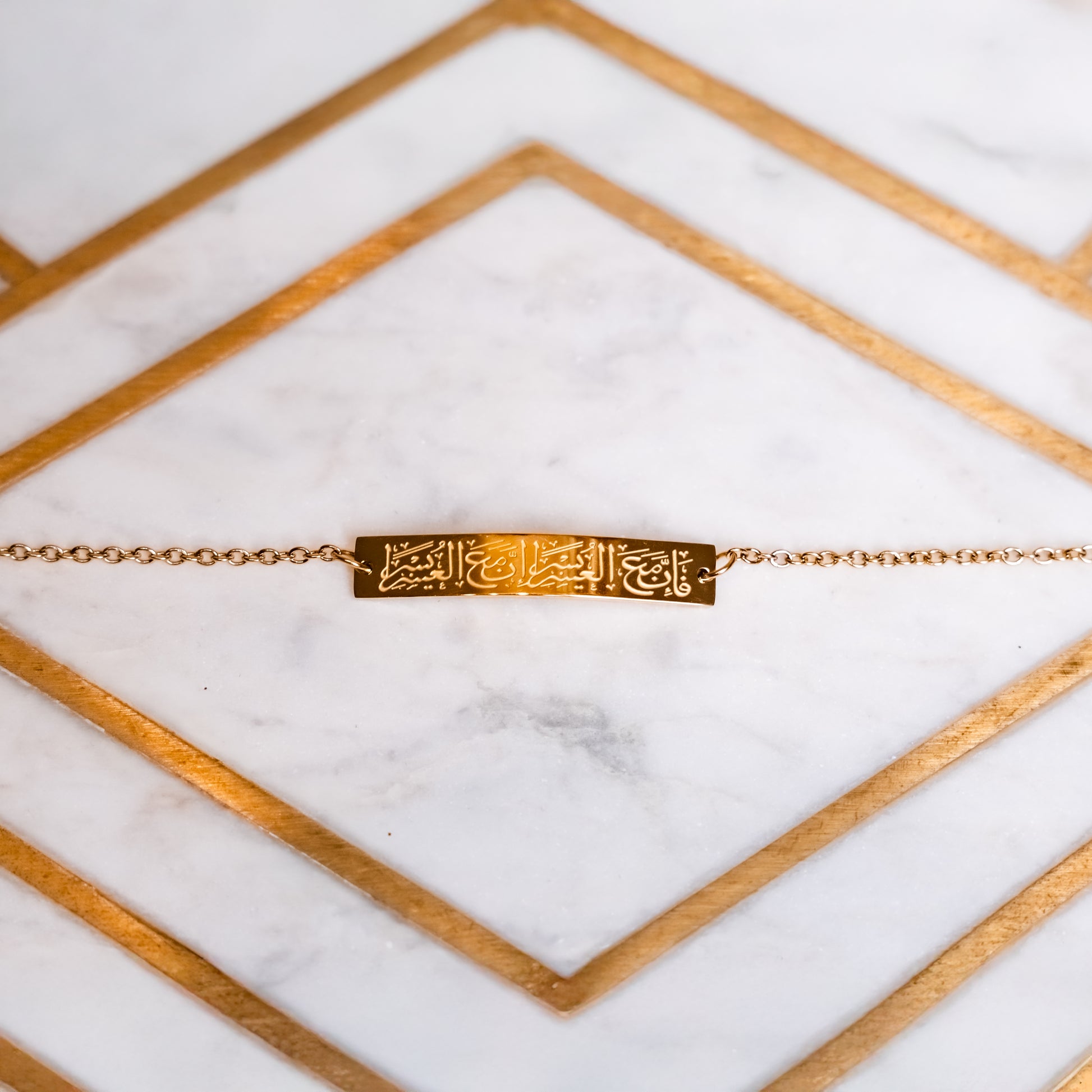 This bracelet features the profound Quranic verse, “Indeed, with hardship comes ease” (Surah Ash-Sharh 94:6), elegantly inscribed on a sleek bar. Its sophisticated design, complemented by flowing Arabic calligraphy, serves as a discreet yet powerful emblem of hope and spiritual guidance during difficult times.