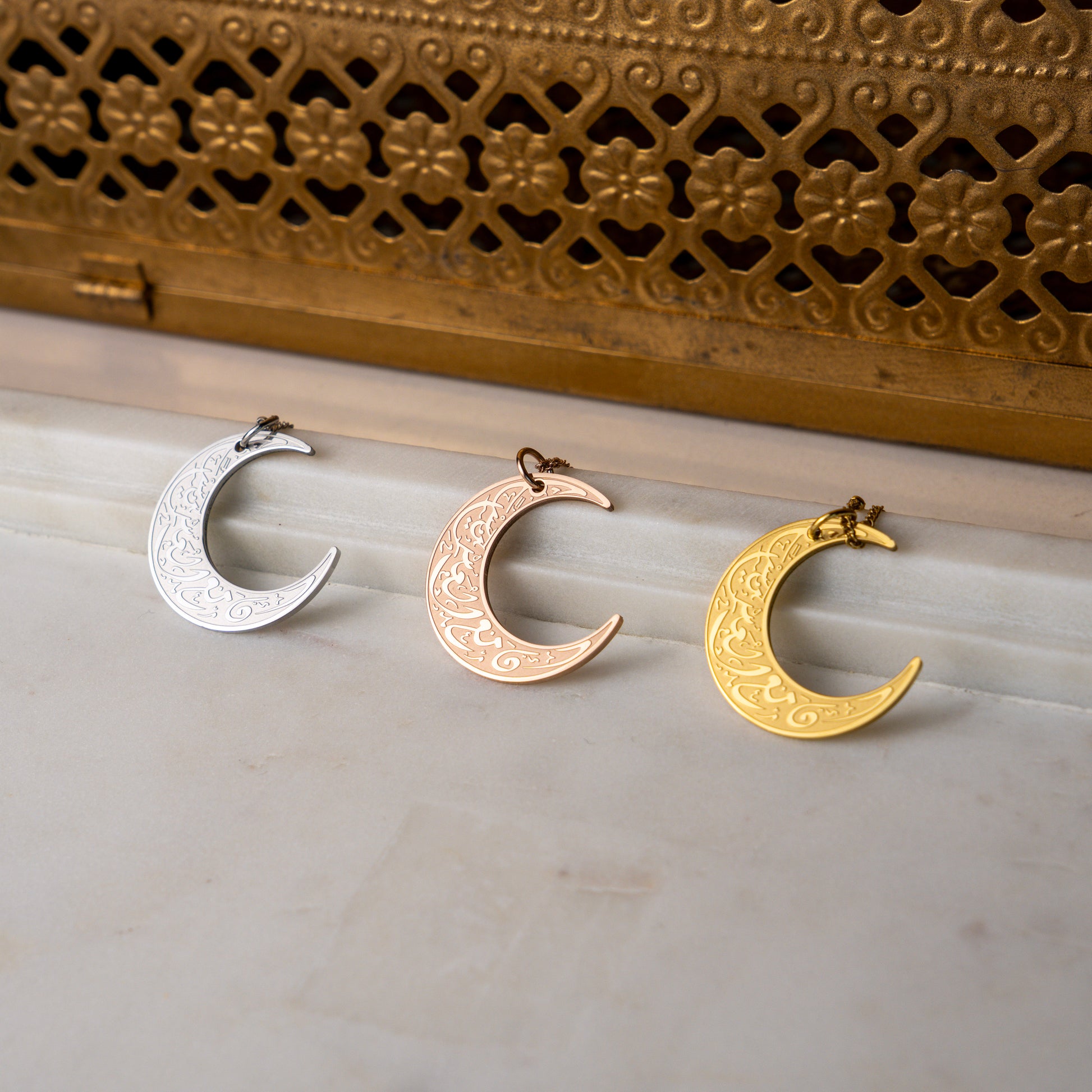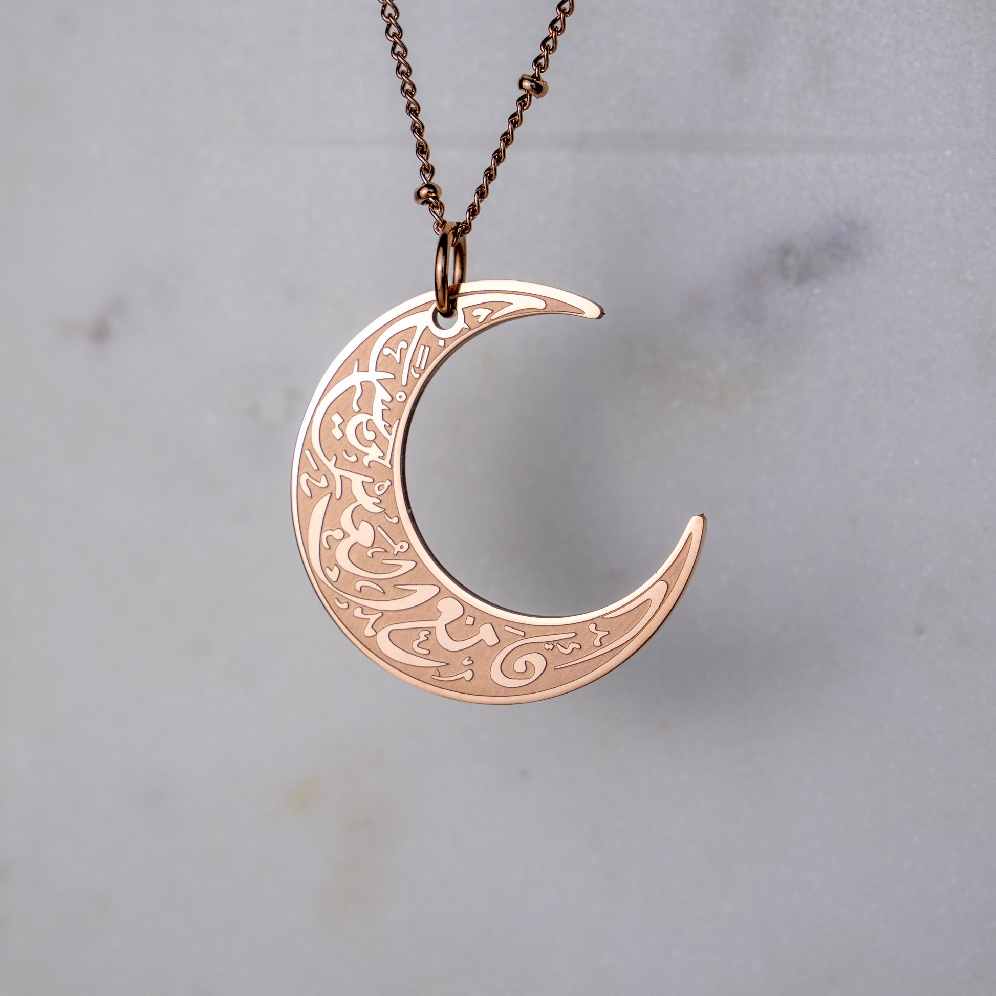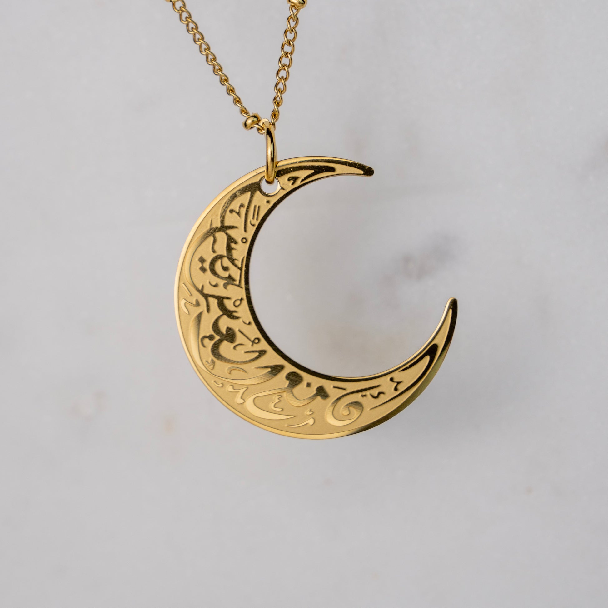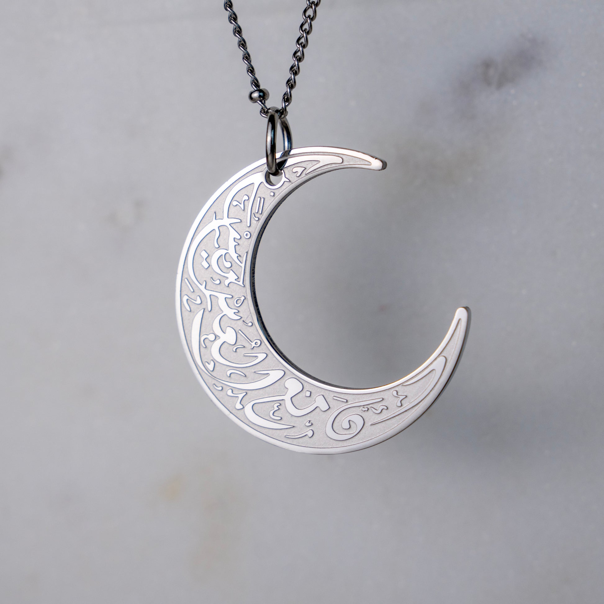 Gracefully inscribed with “Indeed, with hardship comes ease” (Qur’an 94:6.) This crescent moon pendant is a symbol of hope and patience serving as a timeless piece of Islamic elegance and strength.